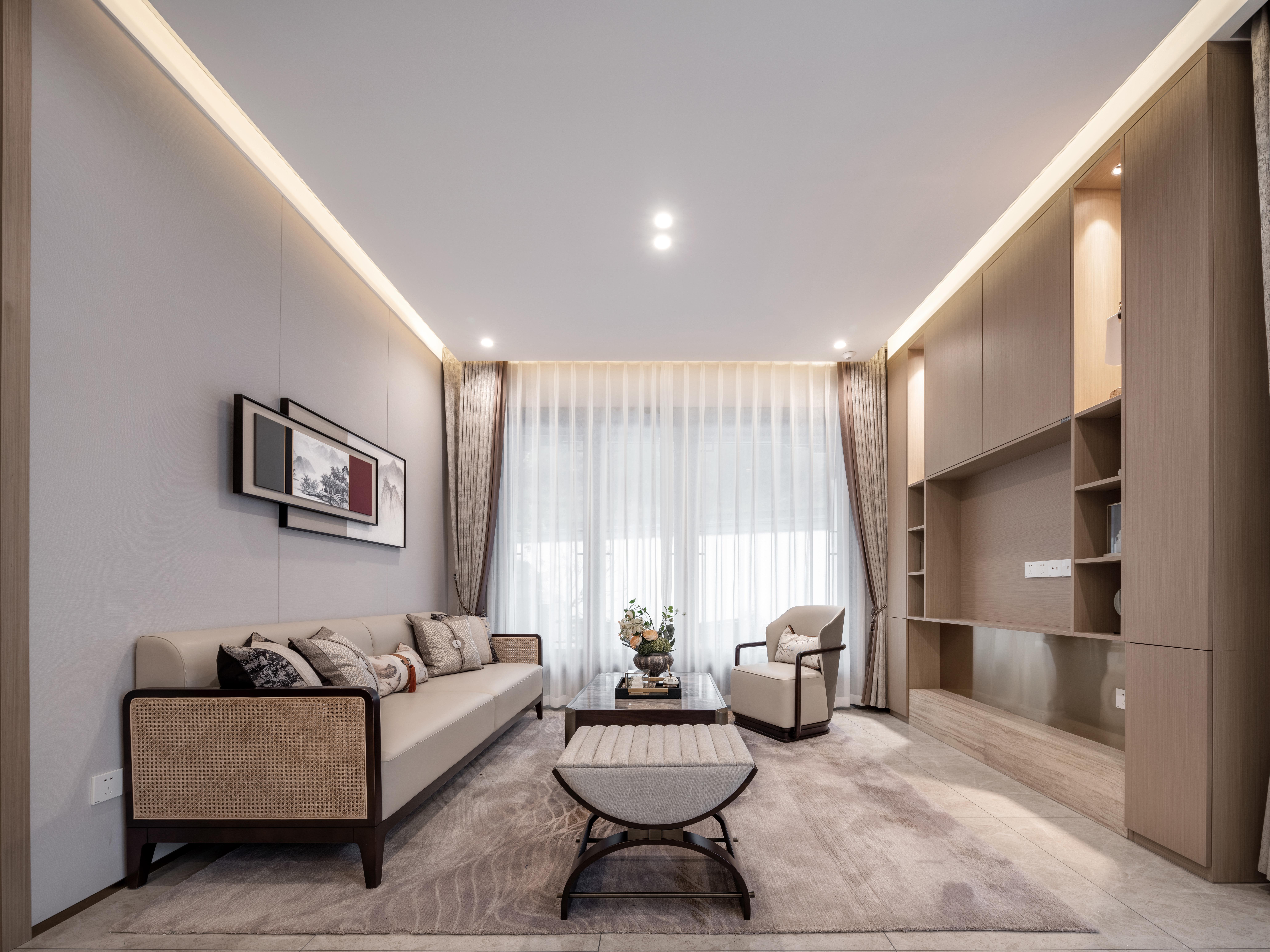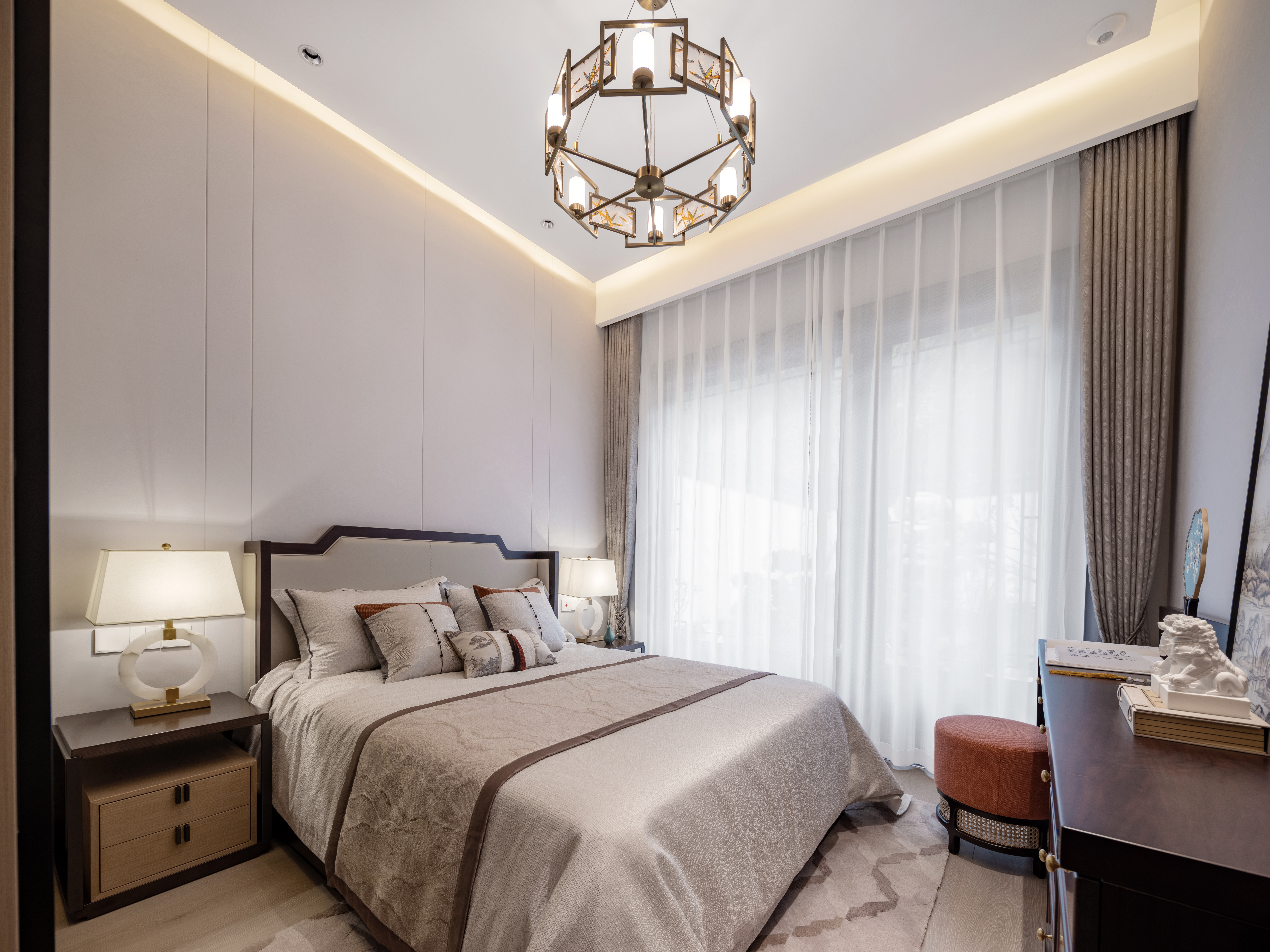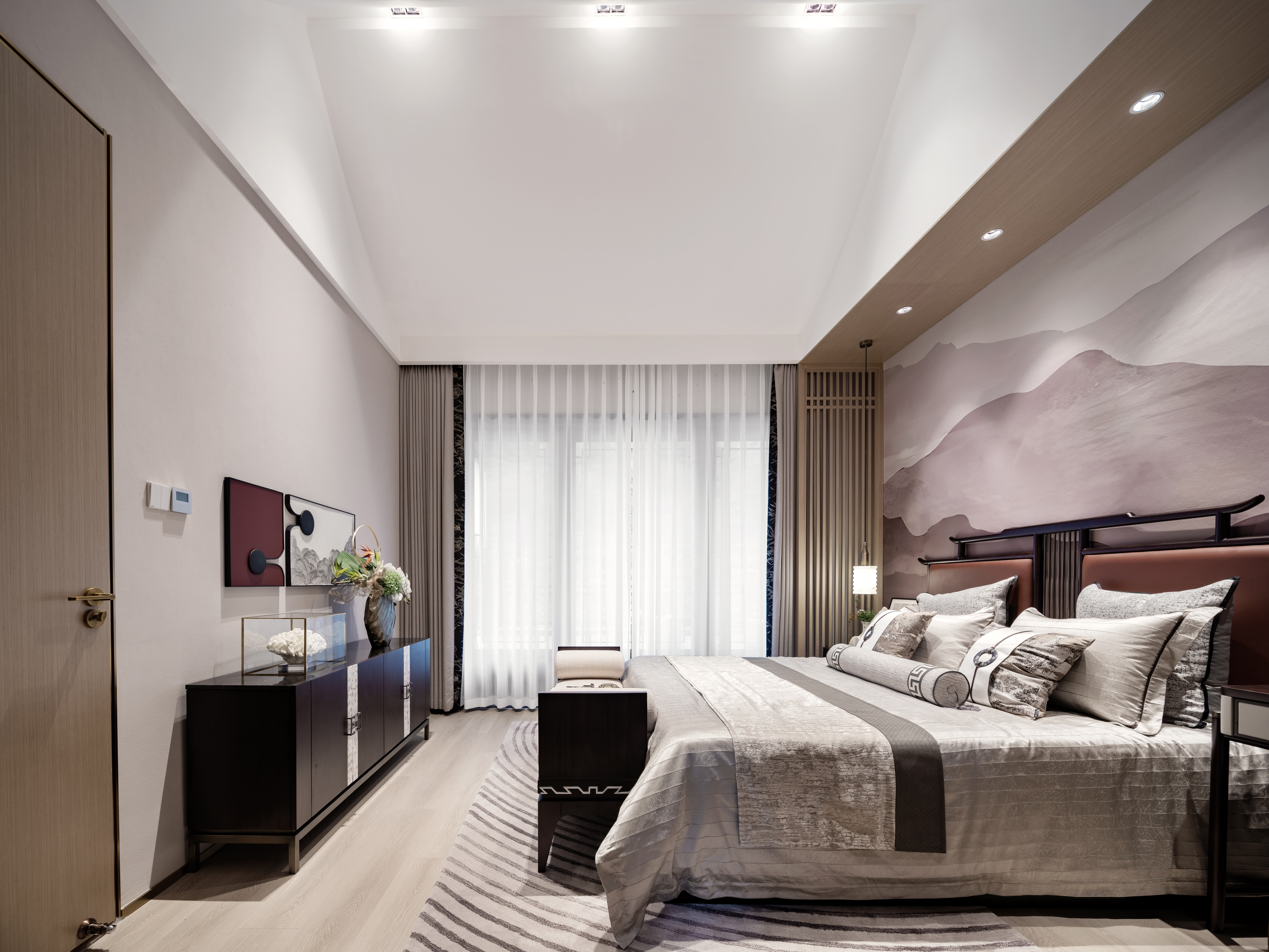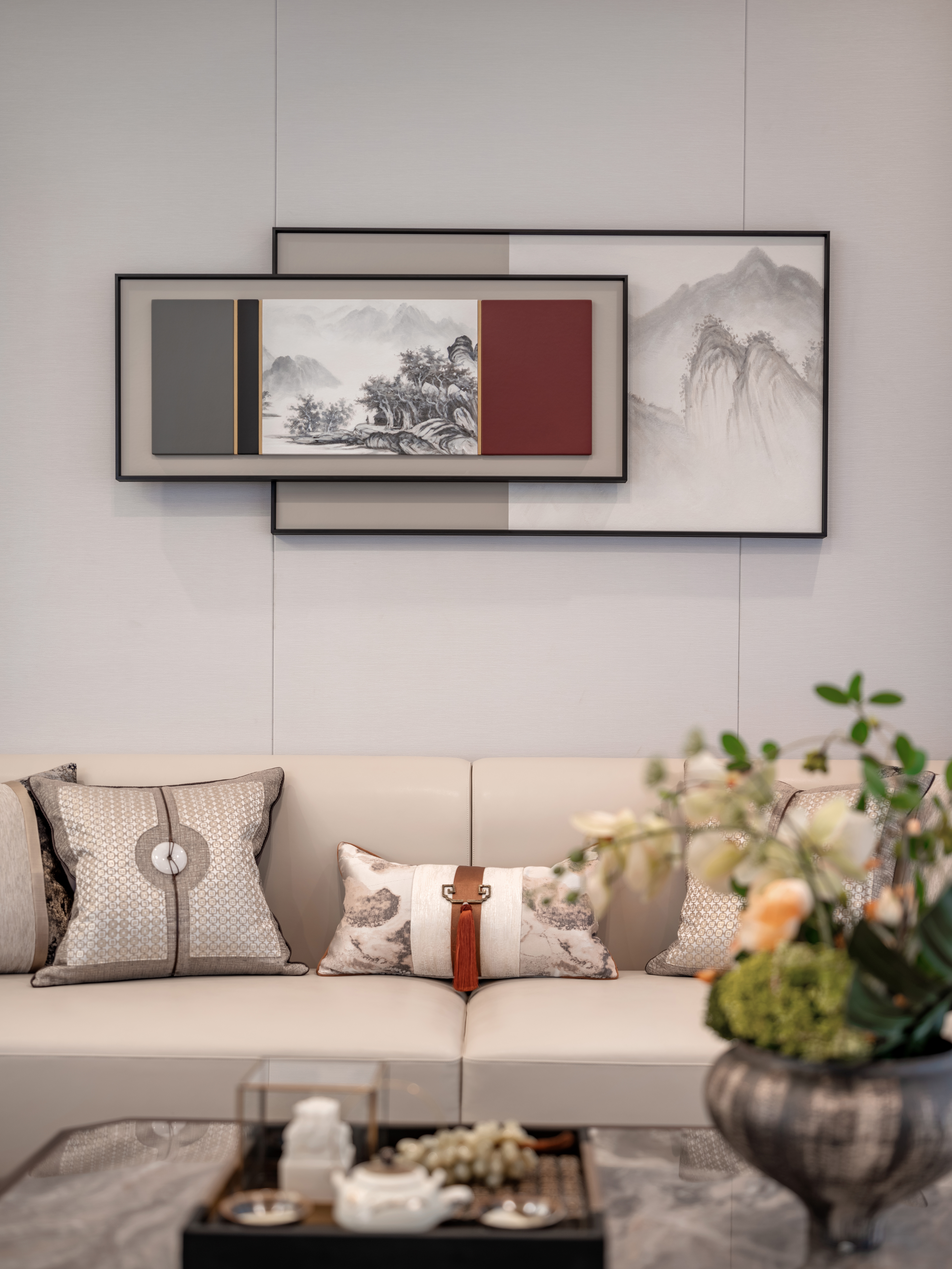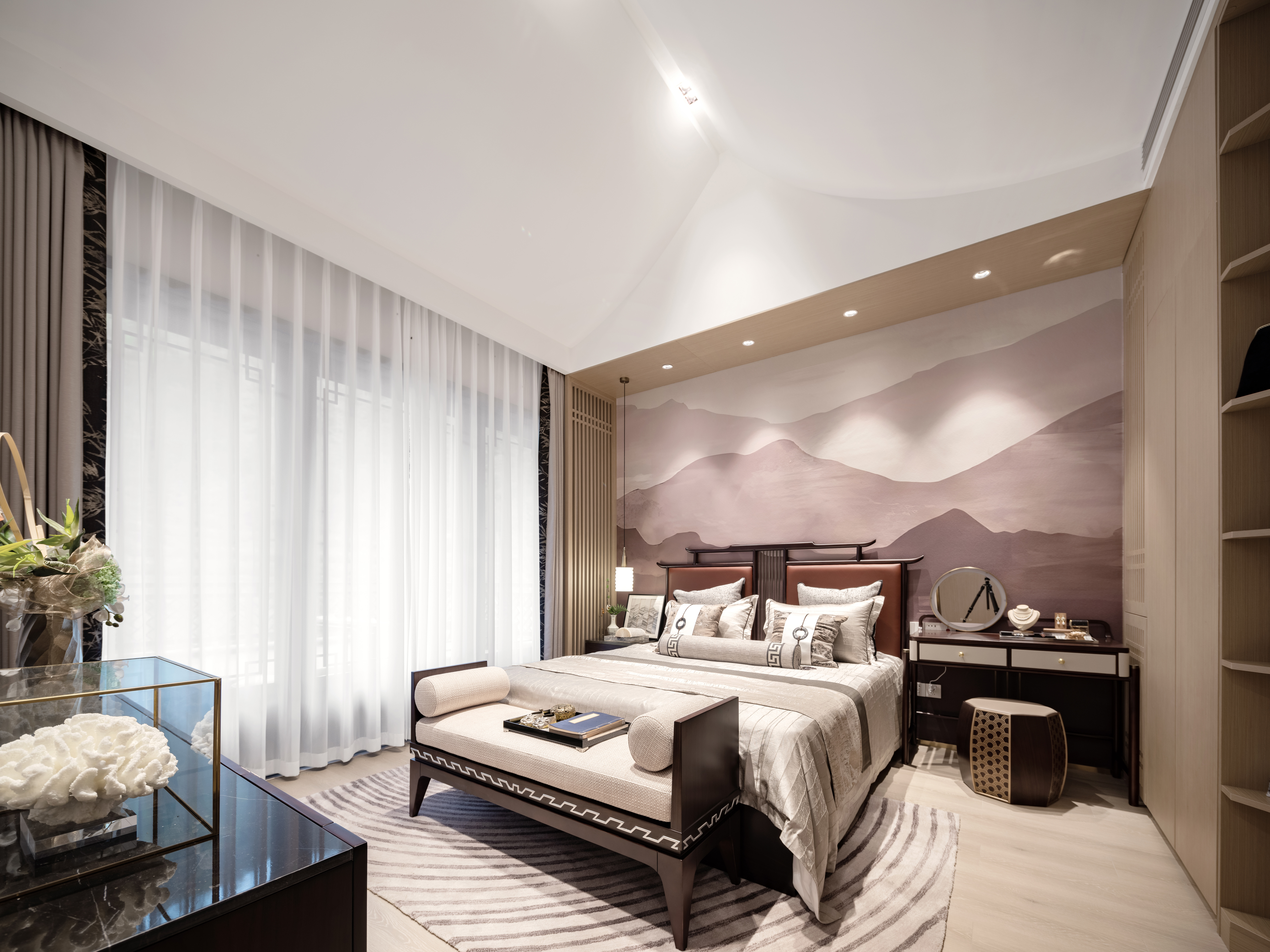 主卧风雅意境既保留了古典东方的样貌,又不失空间主题文化元素的交融呼应。山水、笔墨自由融合的意境,为睡眠空间平添一份灵动之气,将东方之意引入更悠远的境地。