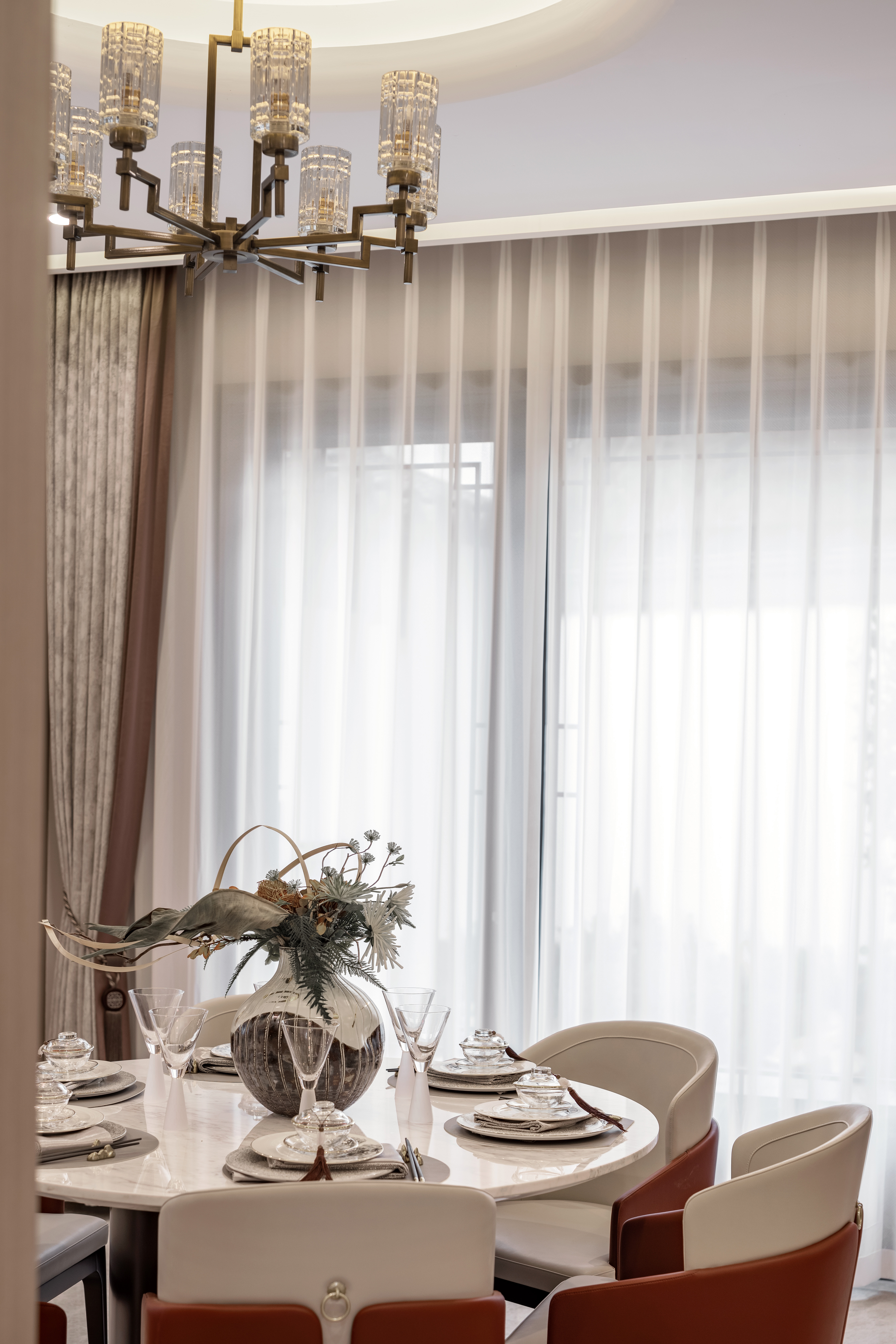 明亮色彩的碰撞,传递中式意蕴及趣味的同时,激活味蕾的感知;丝绸布艺与盖碗的细节点缀,调和深棕木色的沉闷印象,内敛延绵。
