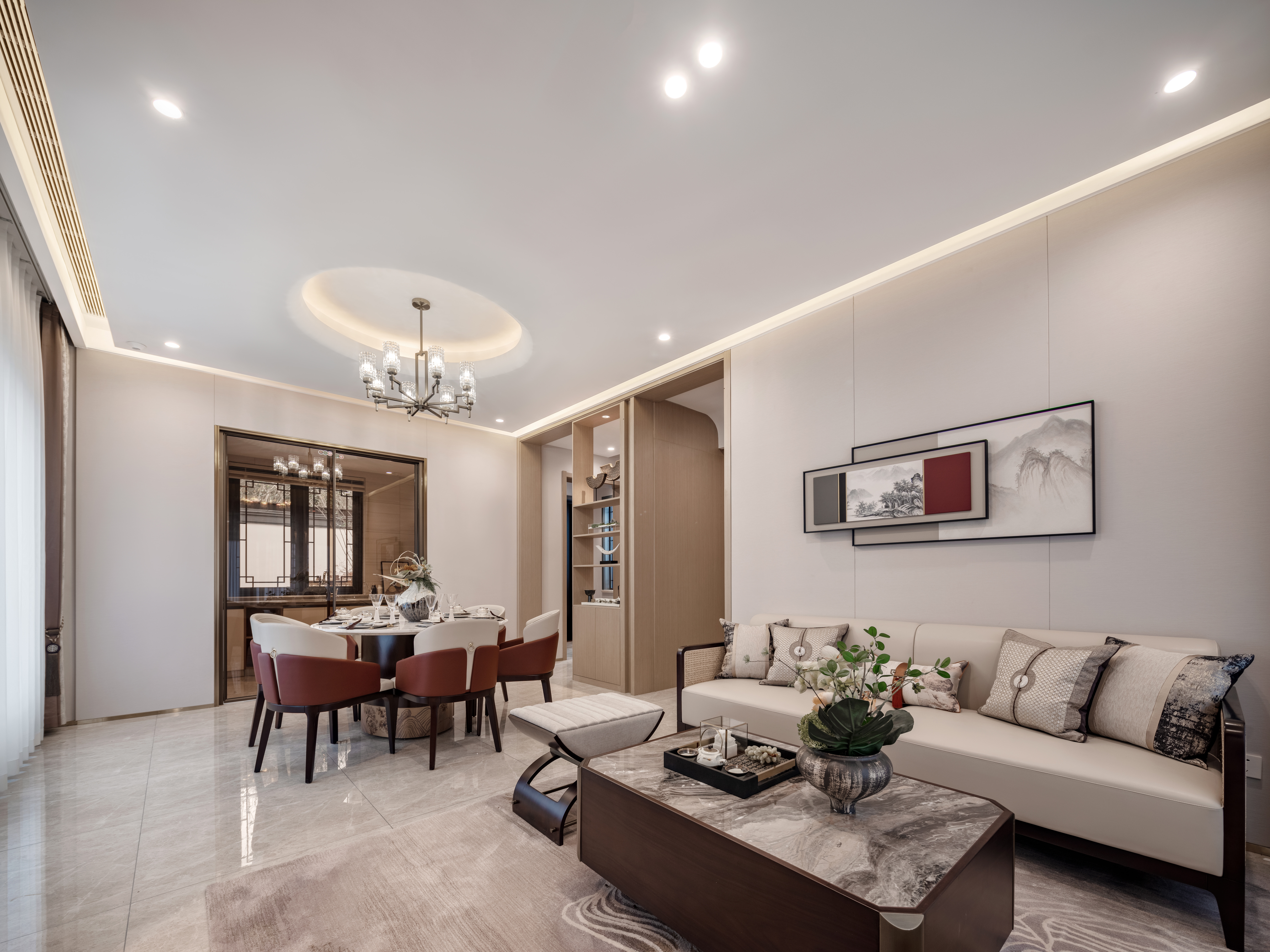 推敲空间尺度顺势施为,客、餐厅不做硬性分隔,而以一体的形式创设开敞氛围。
