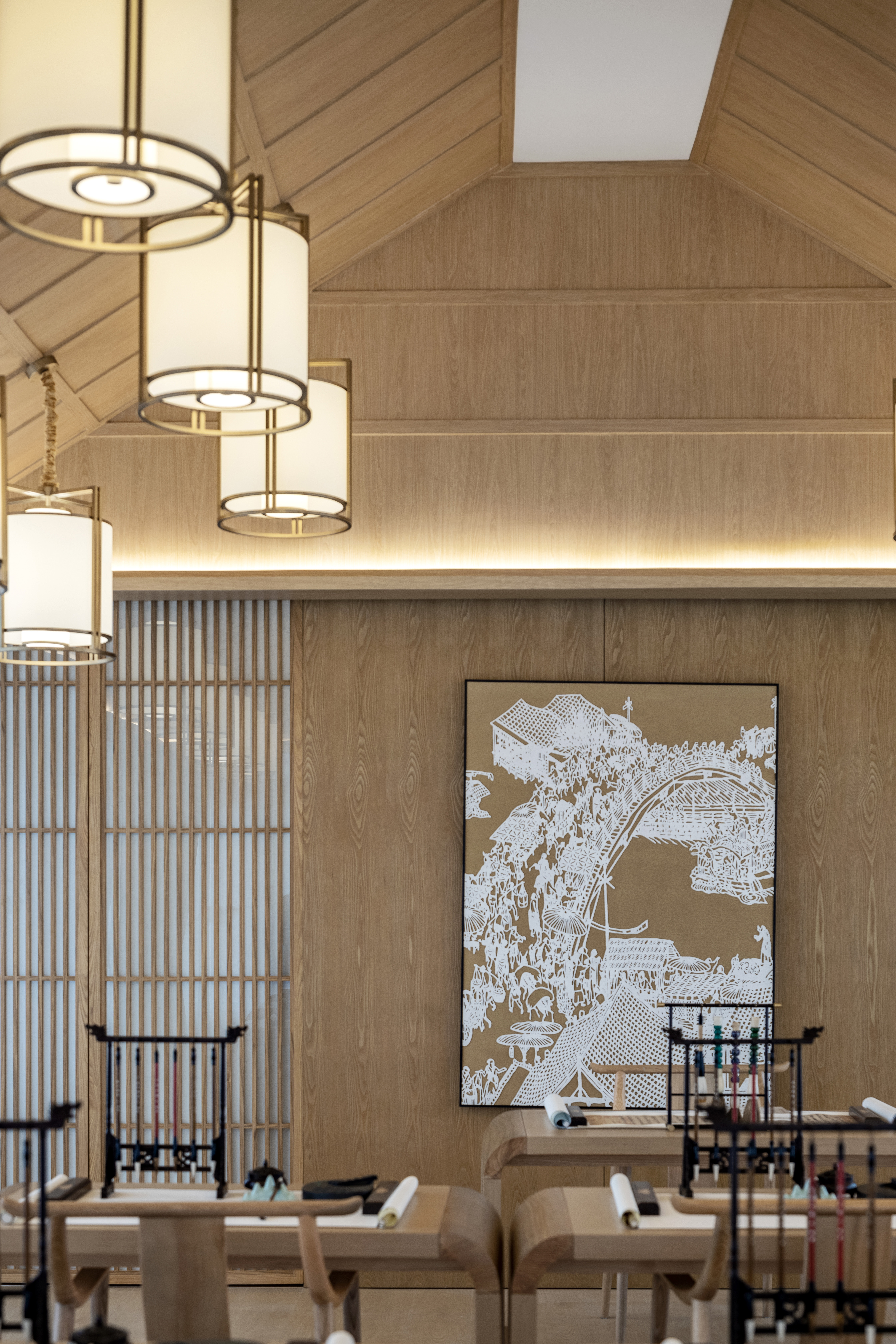 寻着朗朗书声来到颐乐学院,GLD绿檀设计将书桌高度做到750,以满足各种功能性的需求。悬挂以灯笼为造型的吊灯,象征着中国传统的团圆意义。
