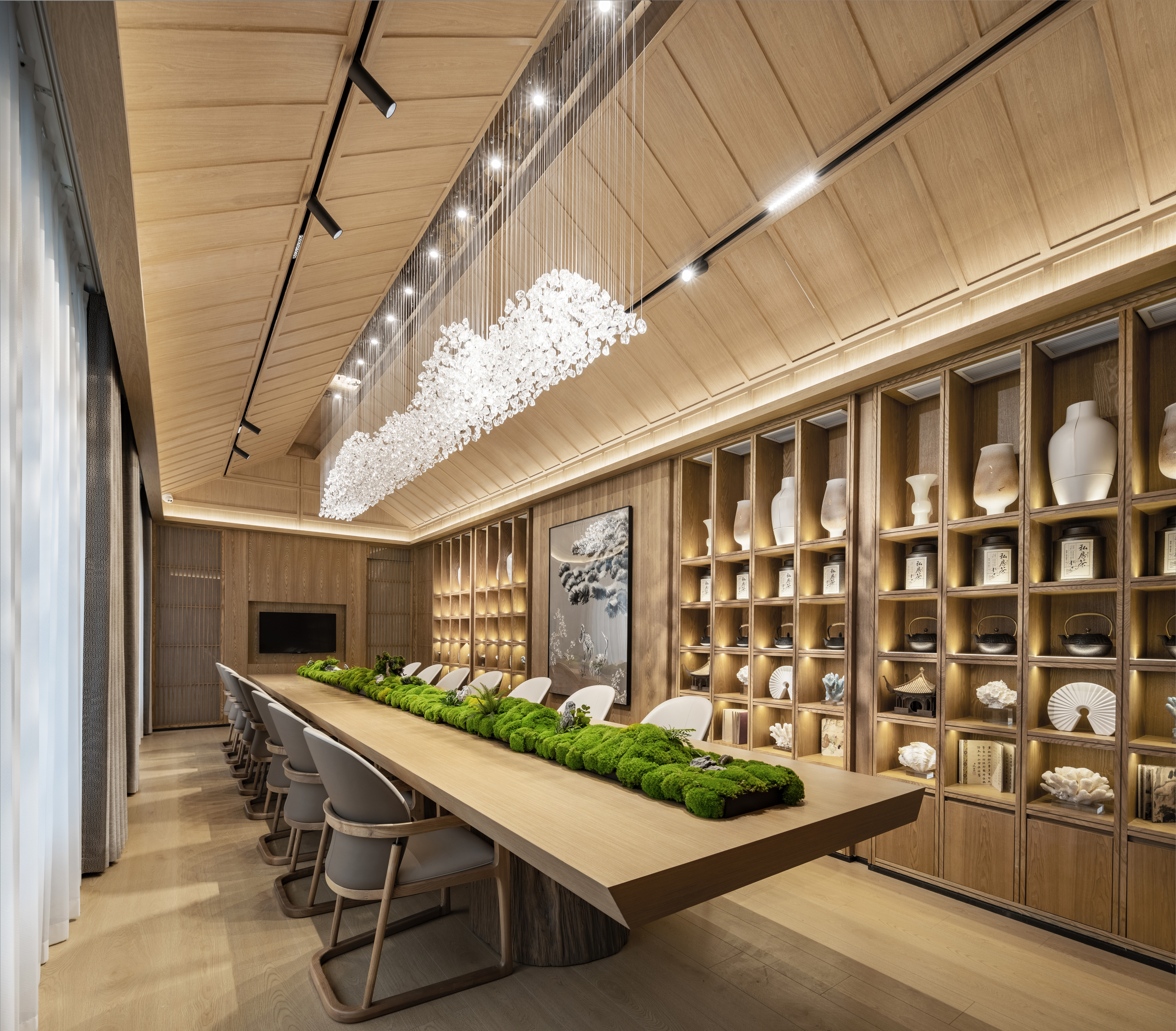 餐厅区域在餐桌桌面上设计了大量永生苔藓,吊顶上悬挂由一粒粒水晶组成的山形吊灯,在灯光的映射下闪闪发光。与原木色的家具,生机勃勃的绿植,相互辉映,营造出一幅自然美景的画卷。