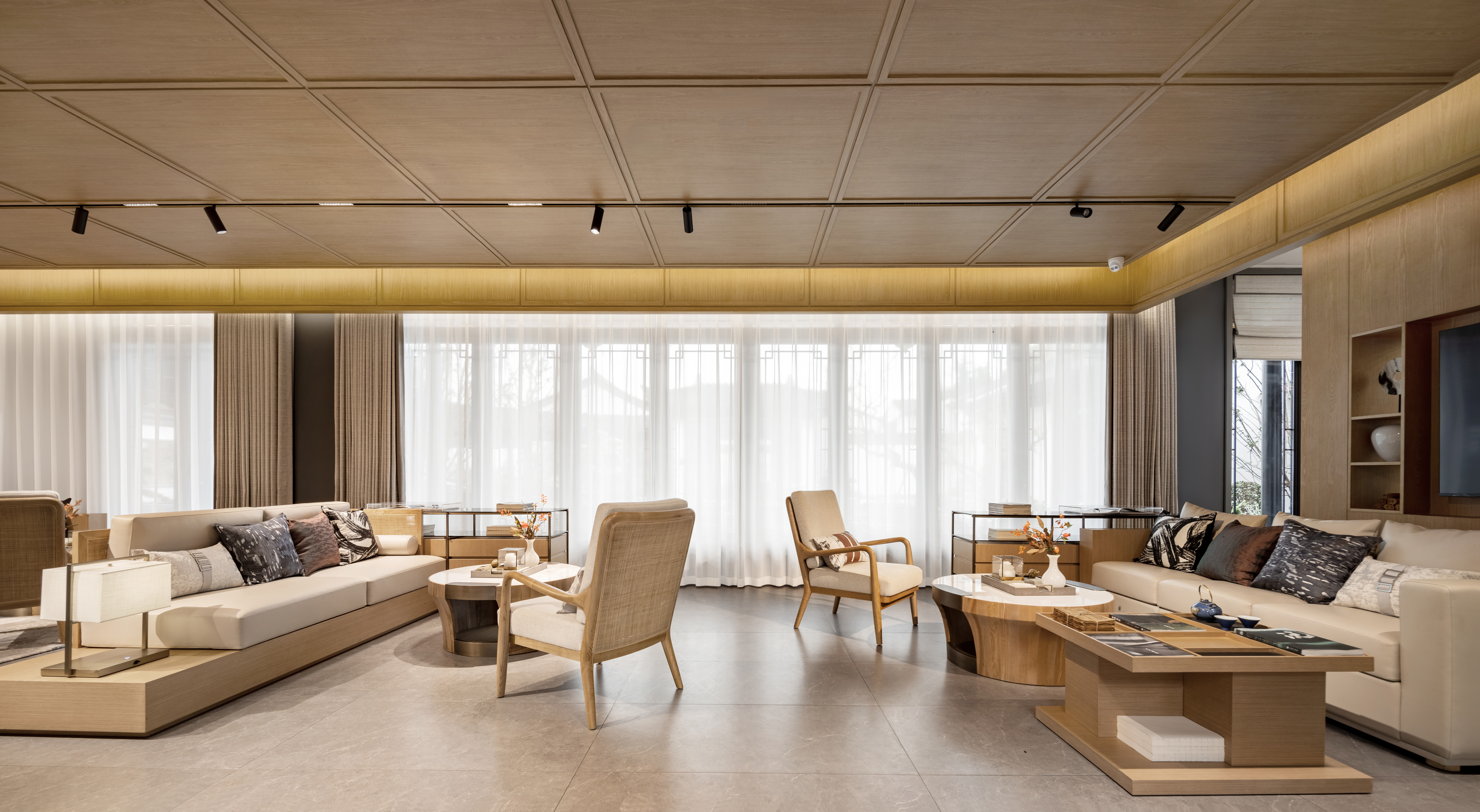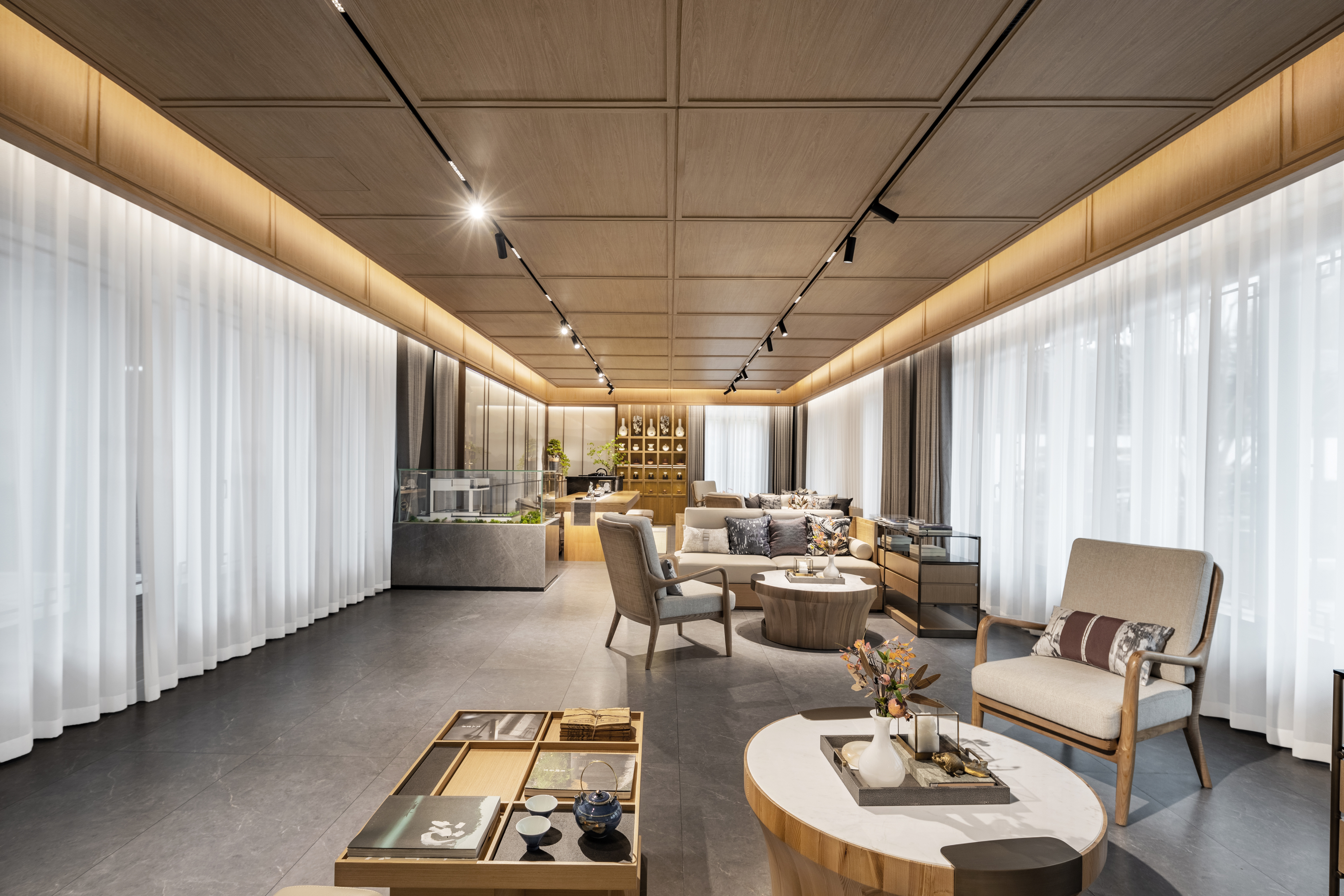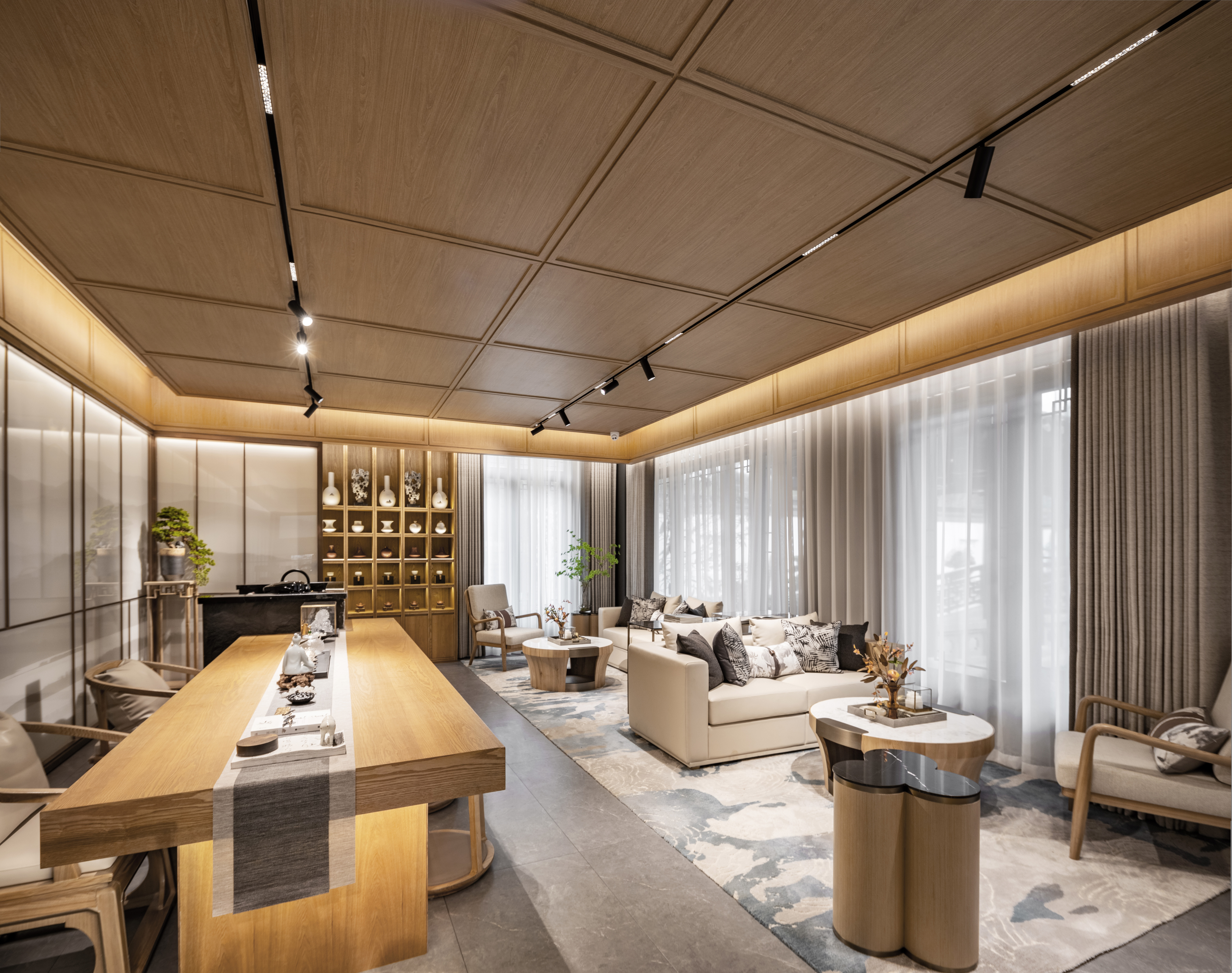 深度洽谈区的设计延续了空间的礼序之美,搭配禅意家具,营造家的真实感受和舒适商谈氛围,光影交错下,沙发上方的抱枕和地毯相得益彰,搭配中式花艺和茶具,艺术质感跃然而来。