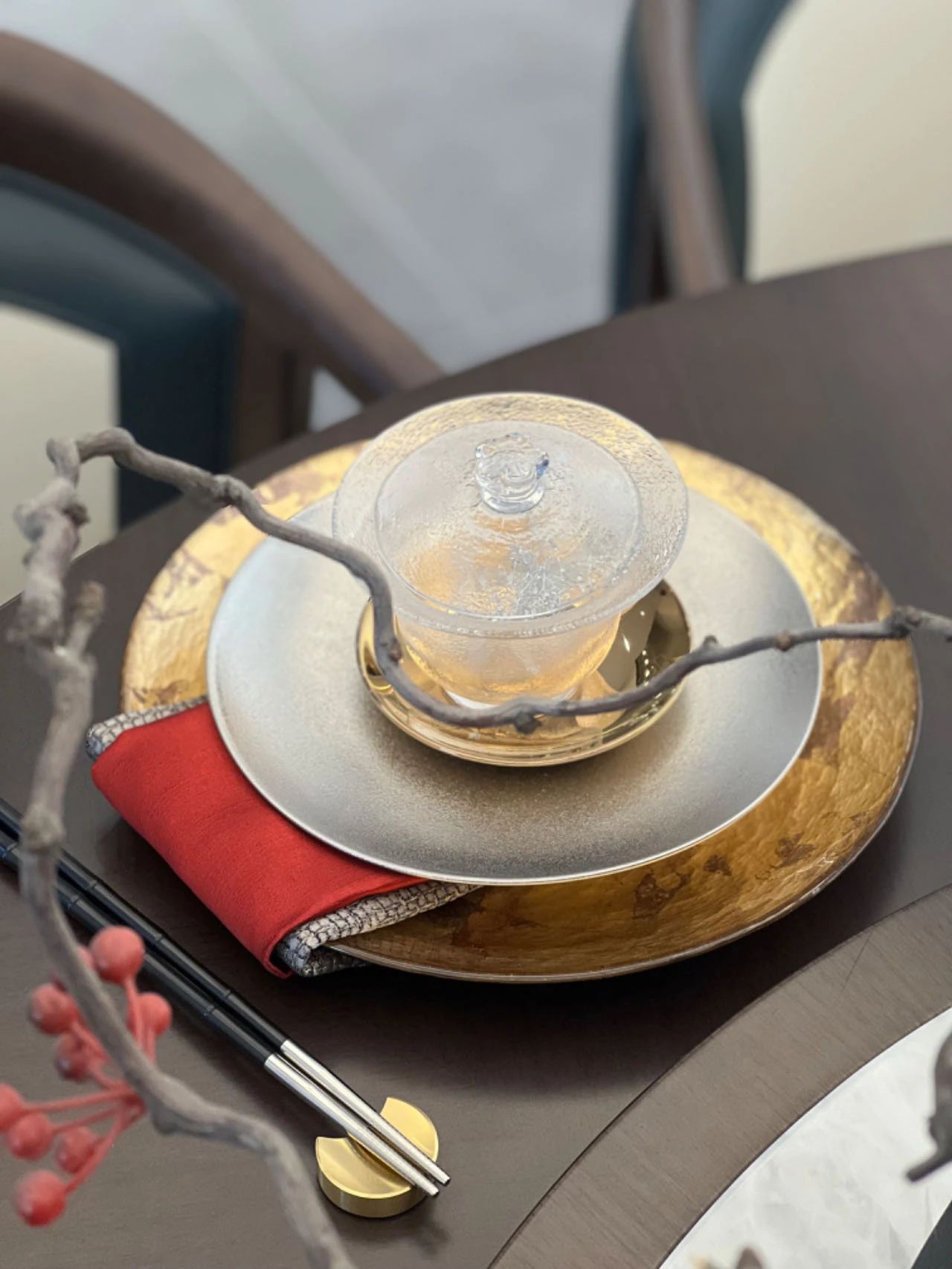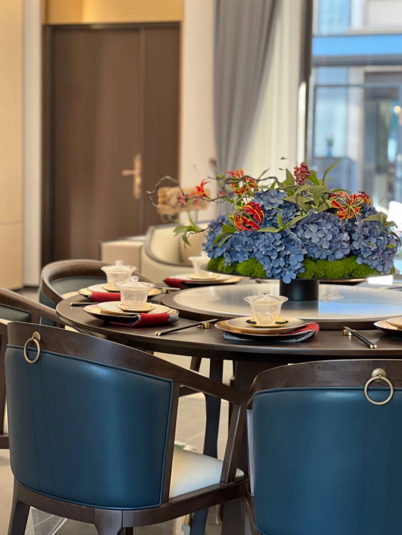 马蹄造型—“马鞍墙”餐桌把中式古建筑结构融入到软装空间中,