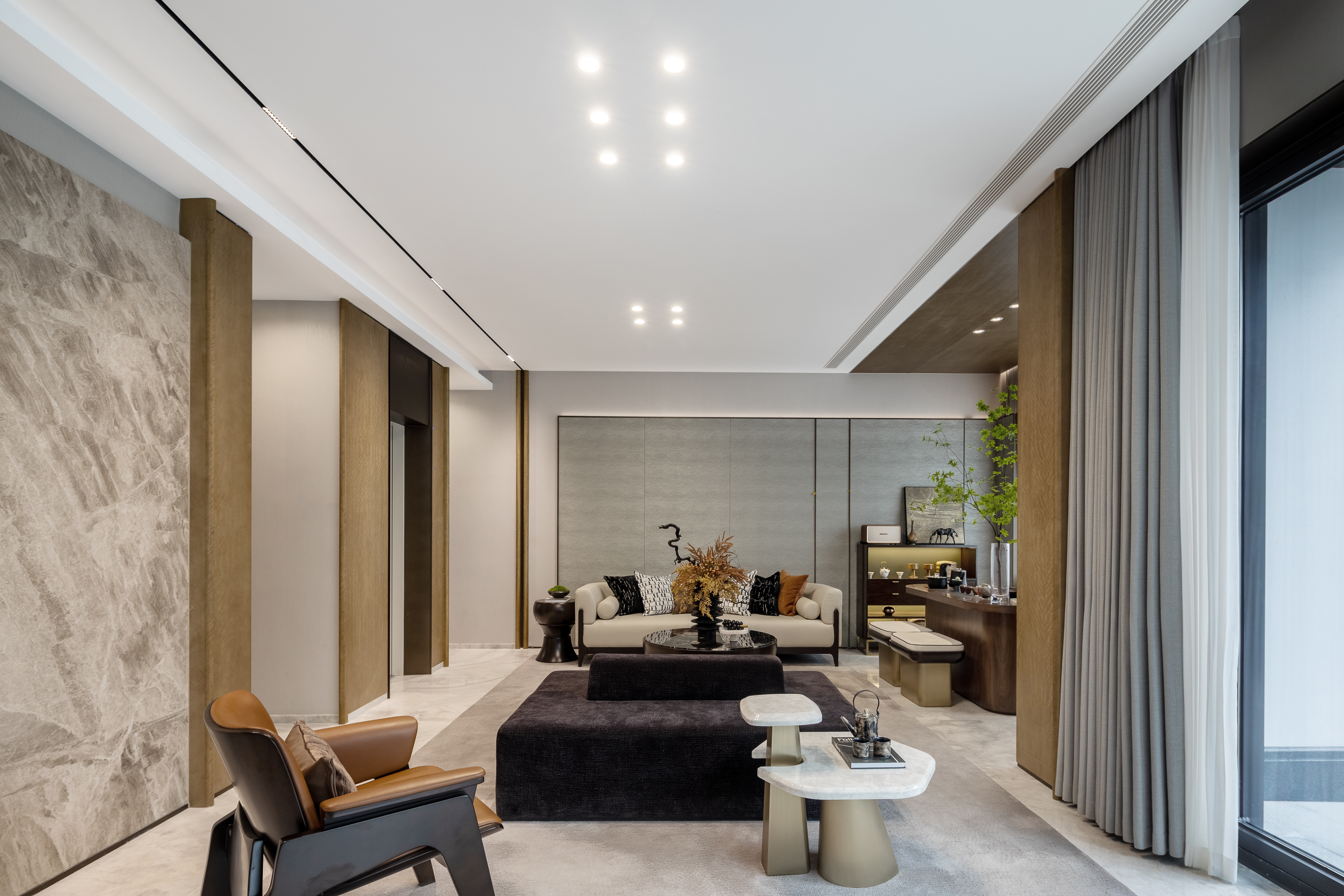 侧灰纹理石材与厅堂一脉相承