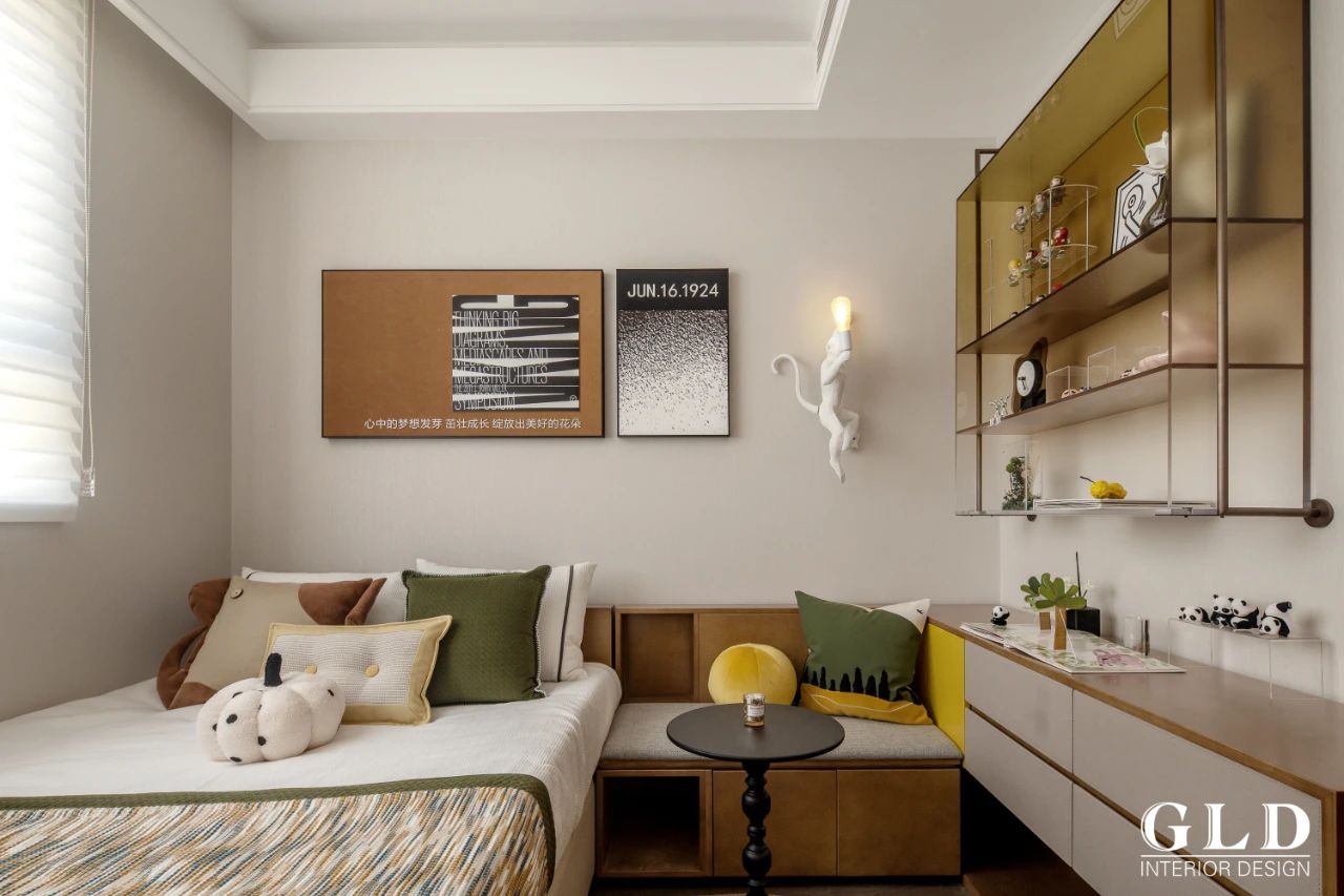 儿童房则注入了更多色彩和趣味,设计师选择了明亮的墨绿色和黄色作为基调,搭配充满童趣的灯具和装饰品,营造出一个充满想象力和活力的空间。The children's room is infused with more colors and fun. The designer chose bright dark green and yellow as the tone, paired with playful lighting fixtures and decorations, creating a space full of imagination and vitality.
